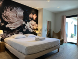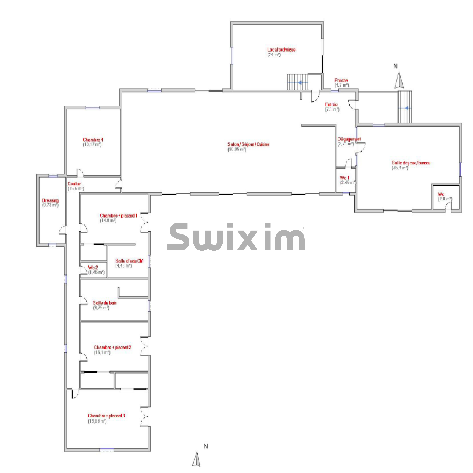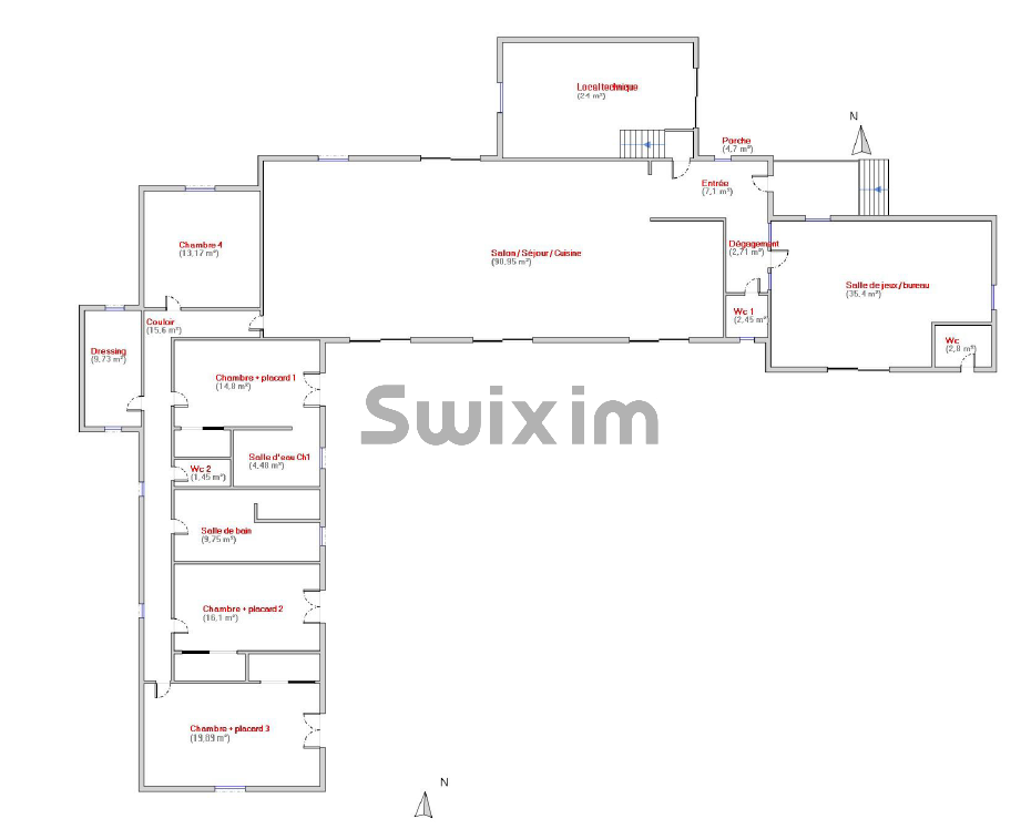 Elle comprend une grande pièce de vie lumineuse, une cuisine entièrement équipée, un bureau spacieux ainsi que 4 chambres, dont une suite parentale avec un accès sur l'extérieur. La maison dispose également d'une salle de bain avec douche et de 2 sanitaires. La propriété assure un confort optimal grâce à la climatisation.