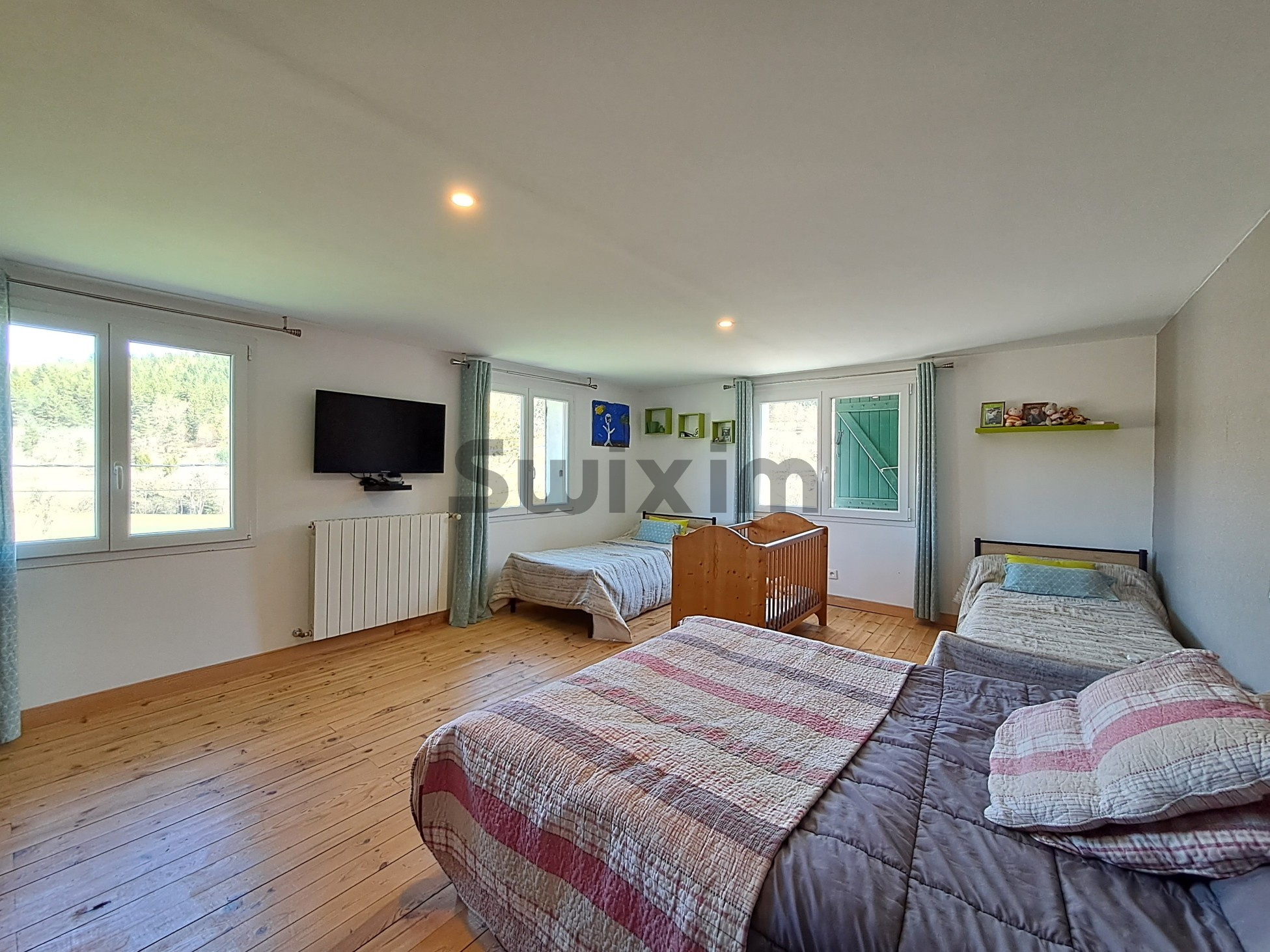 L'espace nuit, situé à l'étage, offre quatre chambres de caractère dont deux très grandes, sublimées par un plancher en bois. Ce niveau est complété par une salle d’eau et une salle de bain, tandis qu'une cinquième chambre a été aménagée sous les combles.