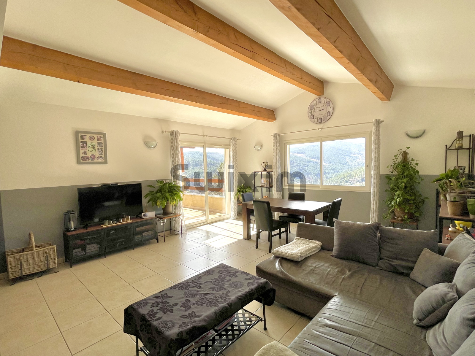 Inondée de lumière, la pièce de vie invite le regard à s’évader vers une vallée verdoyante qui s’étend à perte de vue. D’une superficie de 50m2 le salon-séjour-cuisine, s’ouvre une belle terrasse avec une vue apaisante et sans vis-à-vis sur la vallée. Un espace de vie idéal pour recevoir et profiter en toute sérénité.