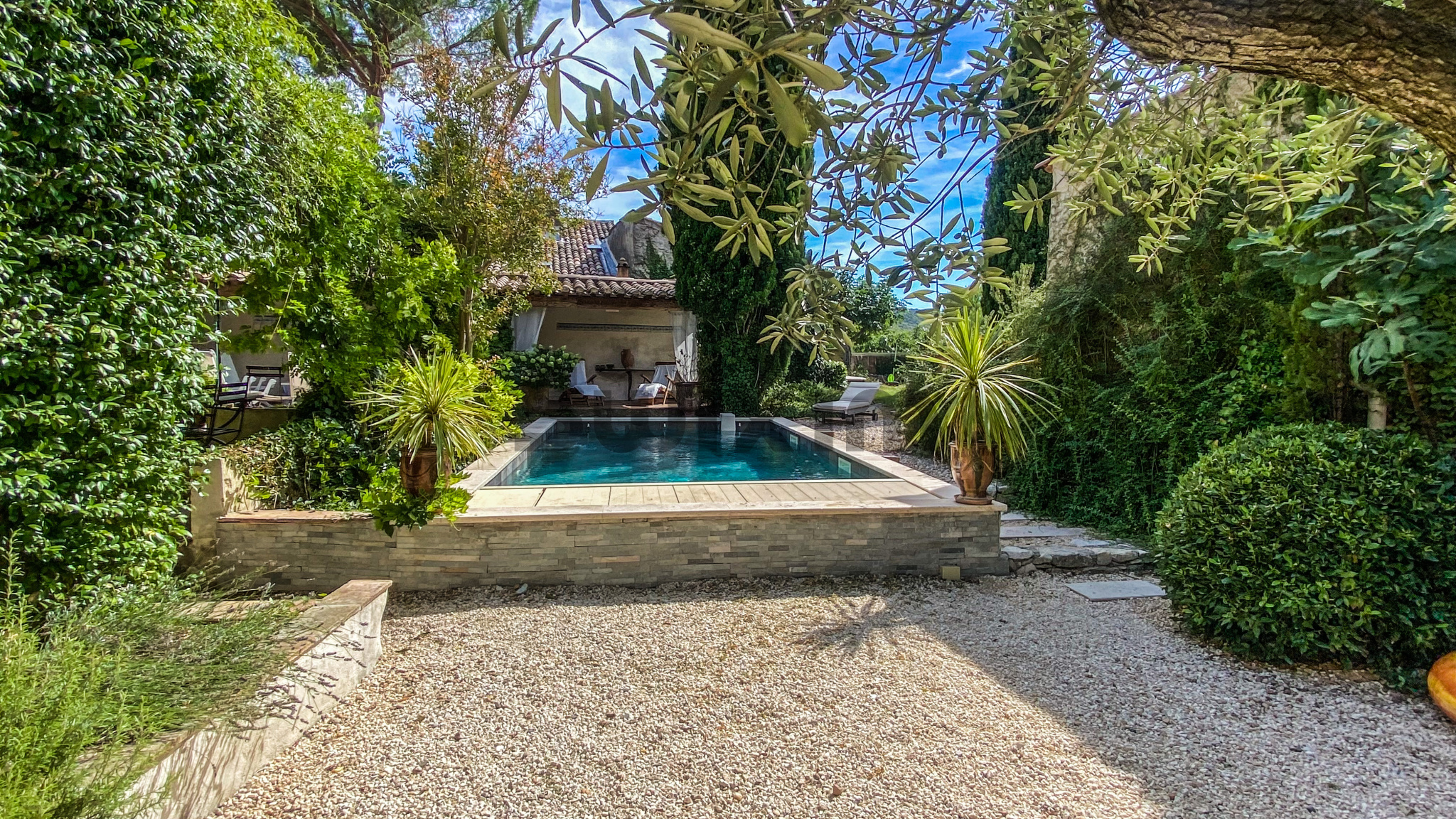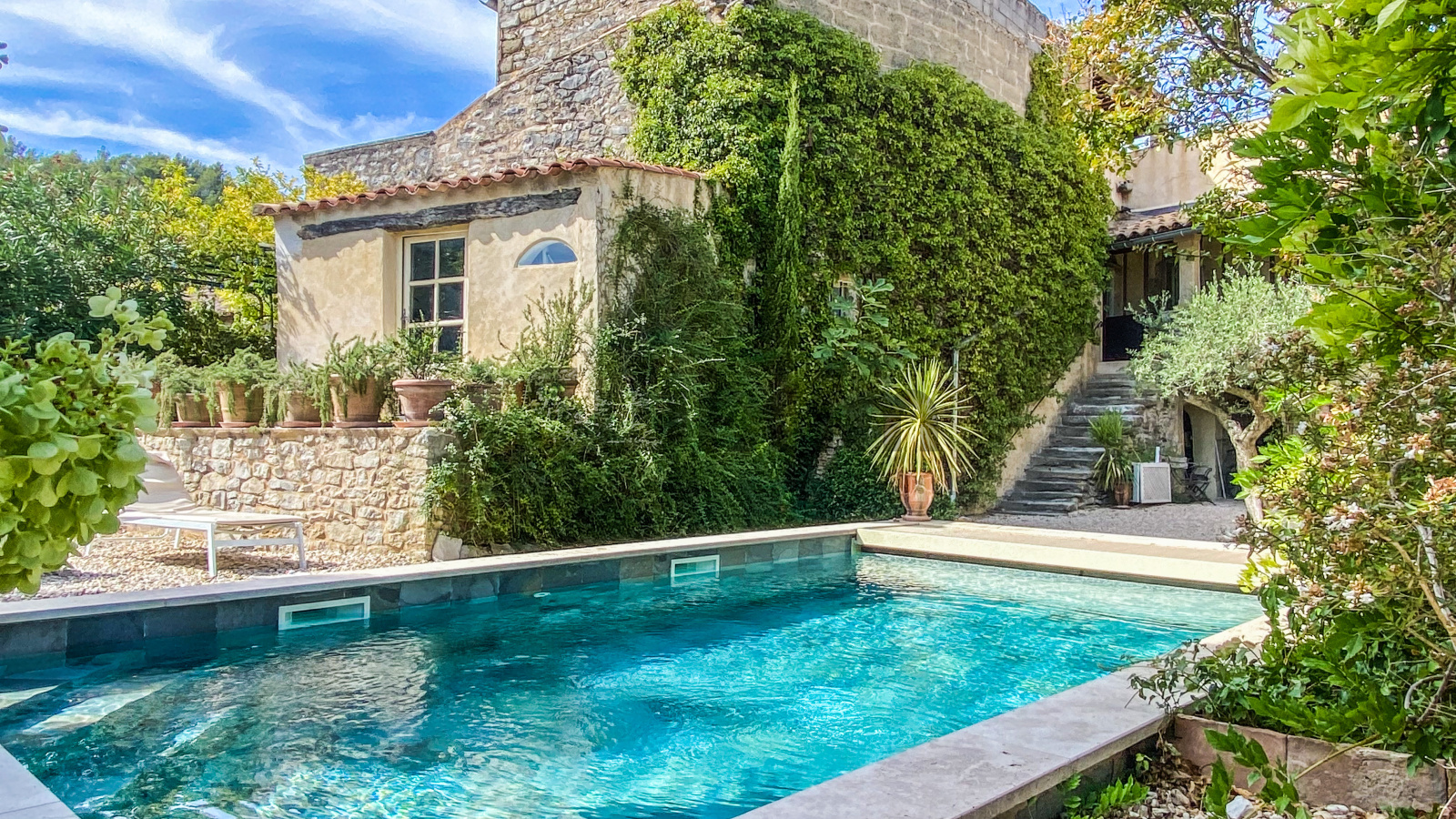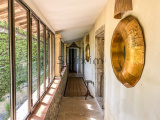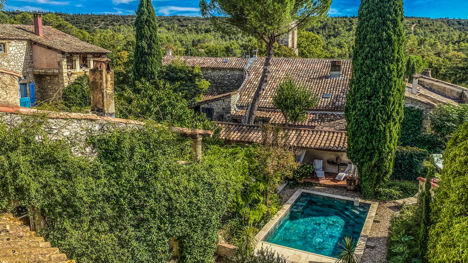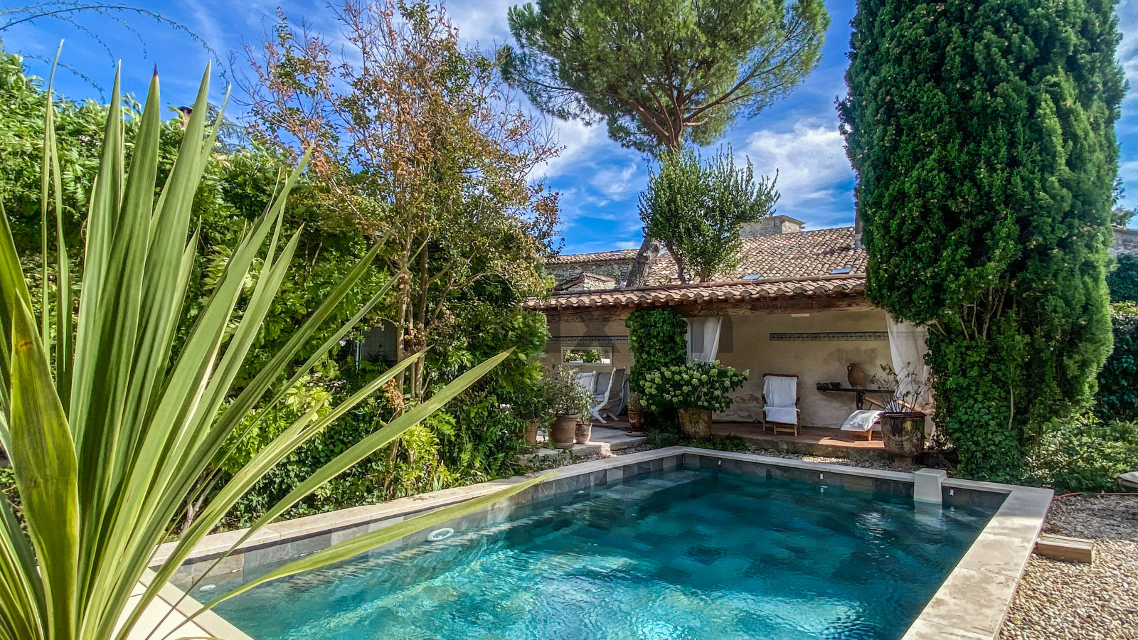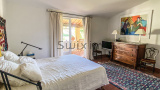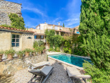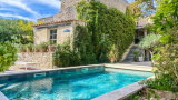 A 11 kms d'Uzès, dans un hameau bordé de collines, COUP DE COEUR pour cette belle propriété de village avec sa vaste cour fermée où l'on accède par un porche fermé, ses terrasses et jardins suspendus dominant les alentours...Cette maison d'environ 250 m2 dont on a su conserver l'authenticité avec le confort d'aujourd'hui est un lieu paisible où peuvent se réunir une grande famille grâce à ses sept chambres et ses cinq salles d'eau-wc avec des accès pour la plupart directs sur le jardin grâce à la coursive, une grande pièce de vie d'environ 60 m2 en rez de jardin, voutée sur la partie salon. La cuisine est équipée d'un piano SMEG et d'une cuisinière à bois comme autrefois. Une terrasse recouverte de glycine pour les déjeuners pendant les heures chaudes de l'été, une petite terrasse couverte, une jolie piscine (7X3,80 m) façon bassin avec rideau électrique et chauffée par une pompe à chaleur au coeur d'un jardin intime et verdoyant d'environ 500 m2 invite à la détente, à l'ombre des arbres ou au soleil selon vos envies. Des caves et une terrasse panoramique complètent ce bel ensemble.