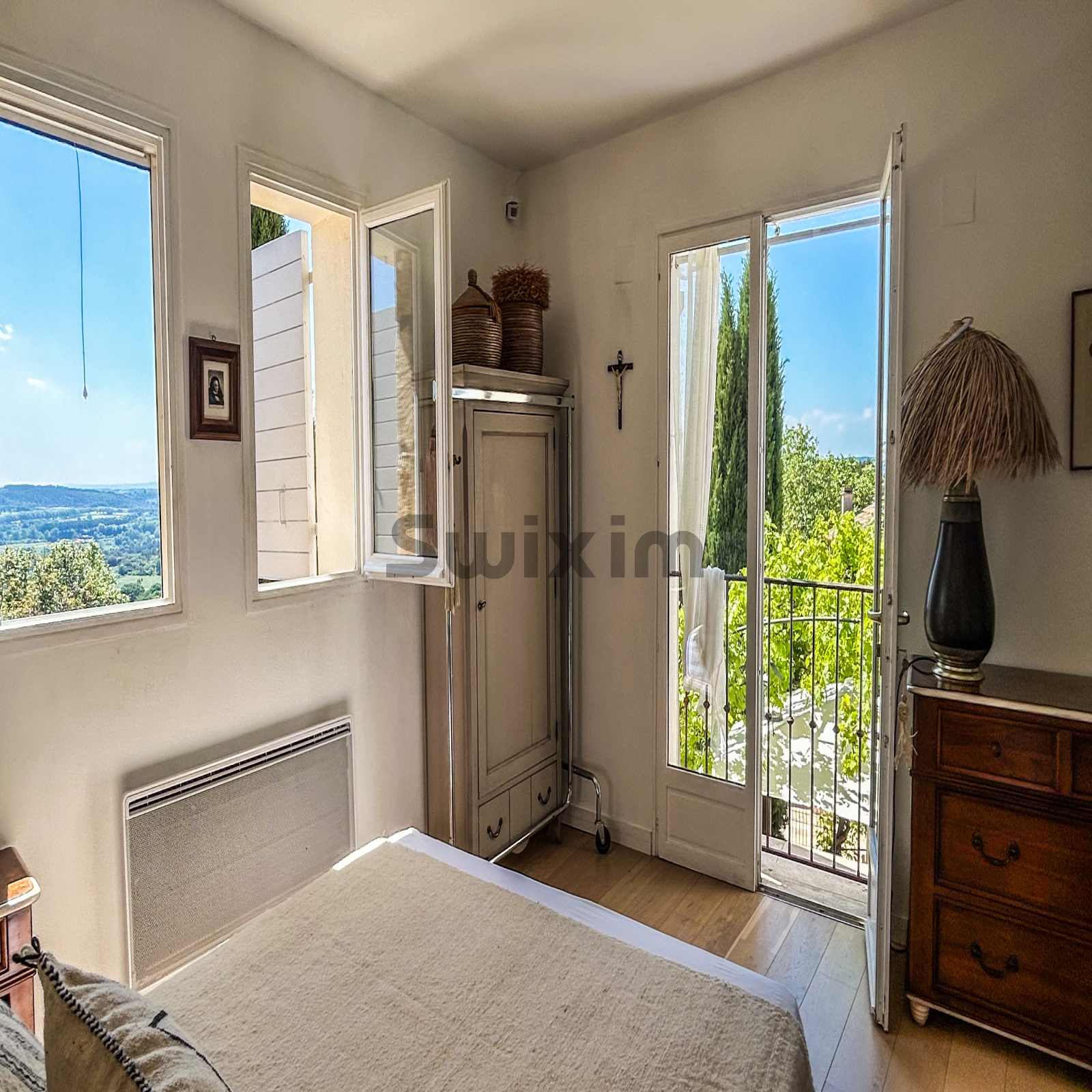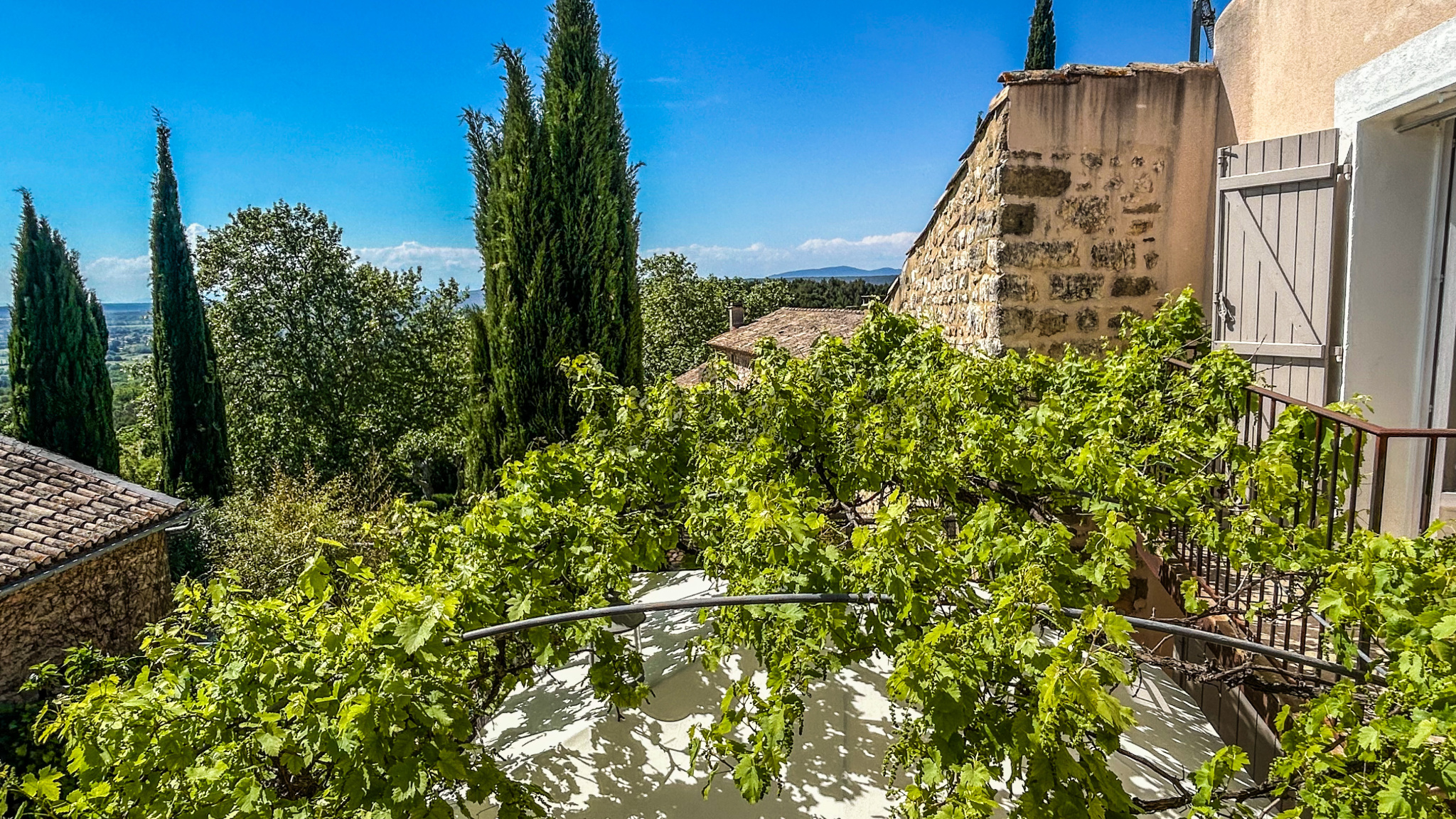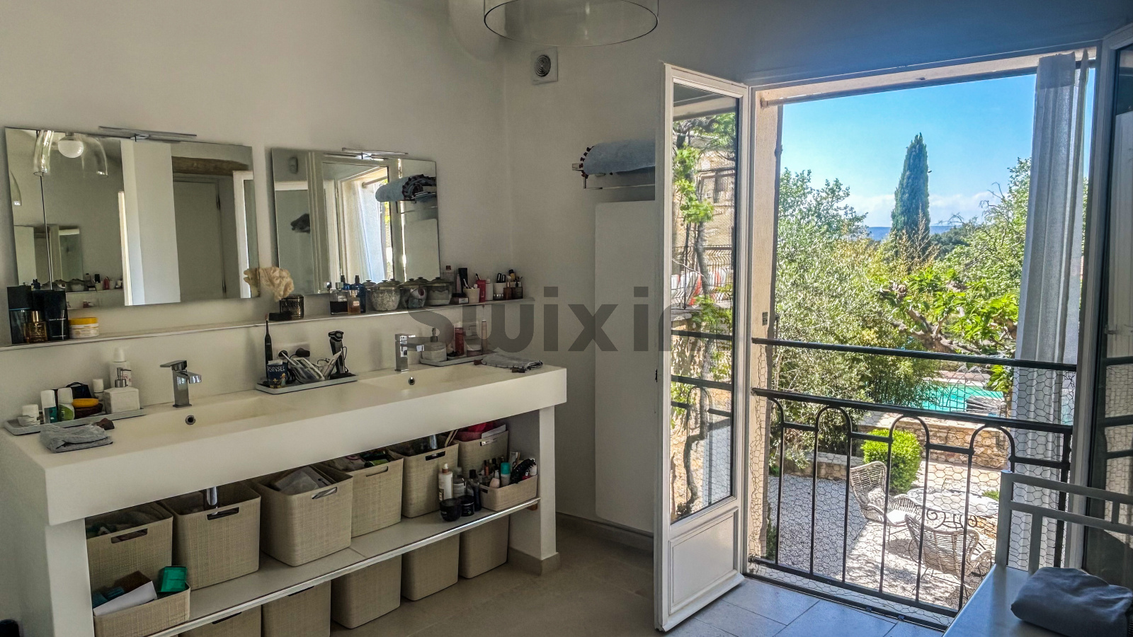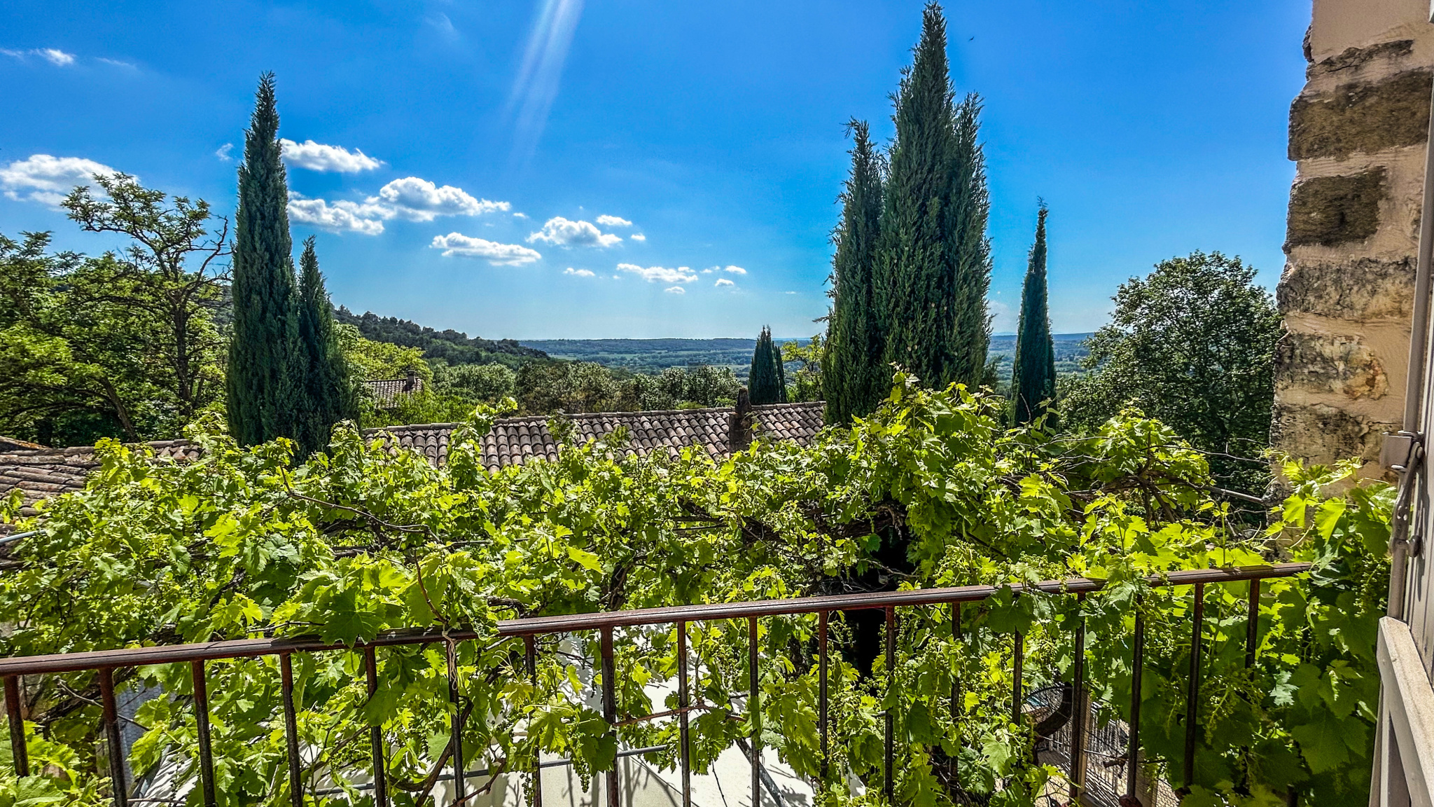 La maison principale se compose d’une vaste cuisine dinatoire d’environ 30 m² et d’un salon avec cheminée (environ 24 m²), tous deux ouverts sur une belle terrasse ombragée par une vigne, offrant un panorama remarquable. À ce niveau également, une grande salle d’eau avec WC, baignée de lumière.