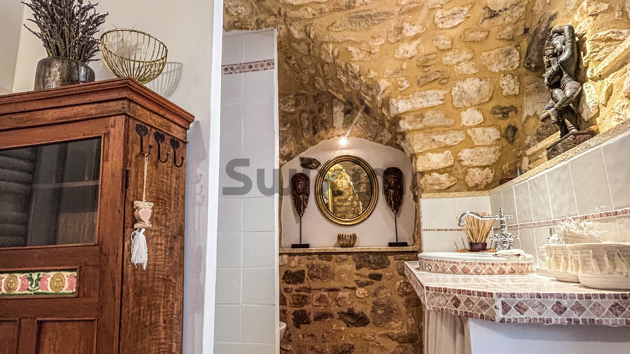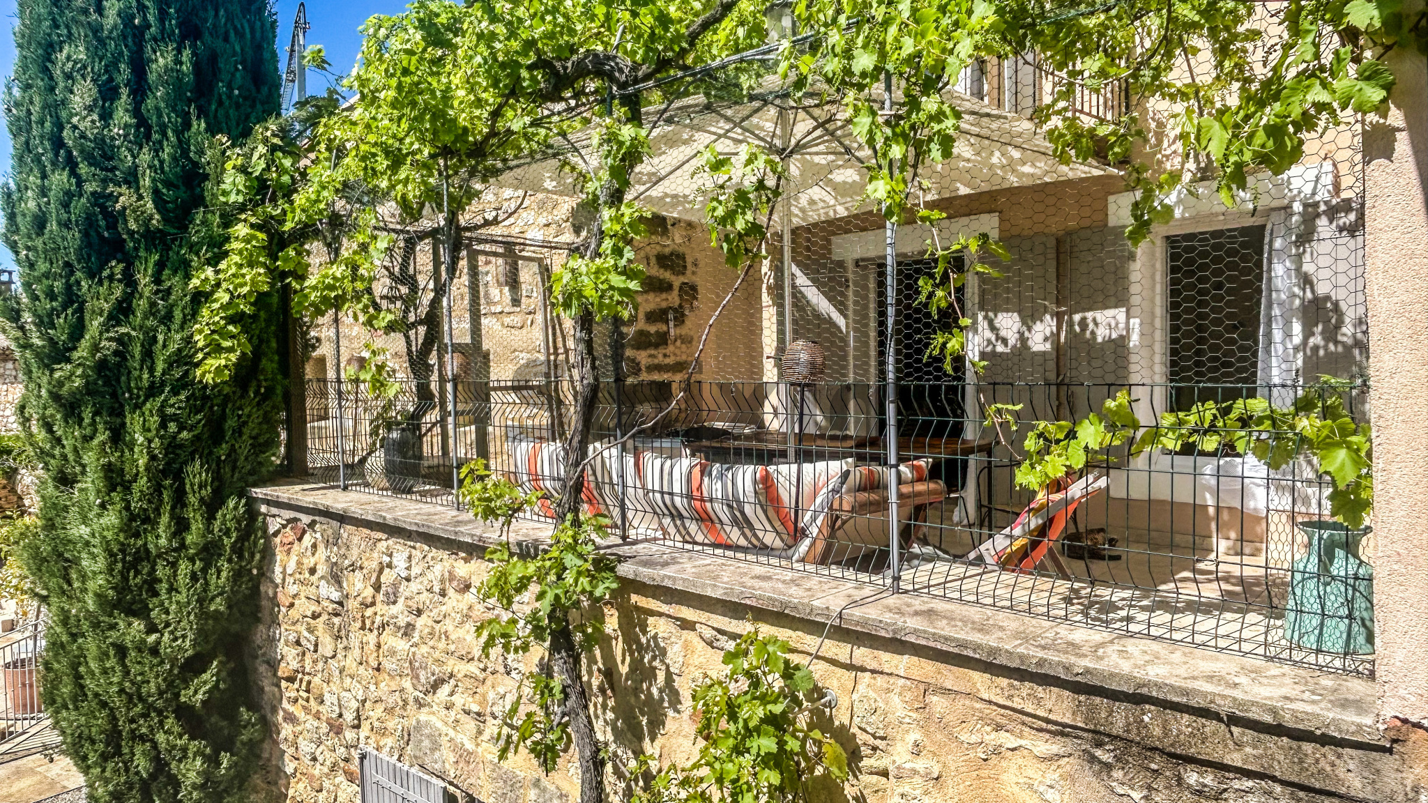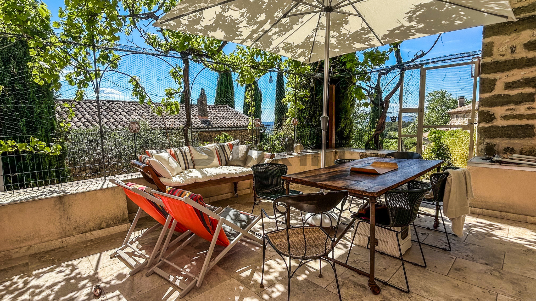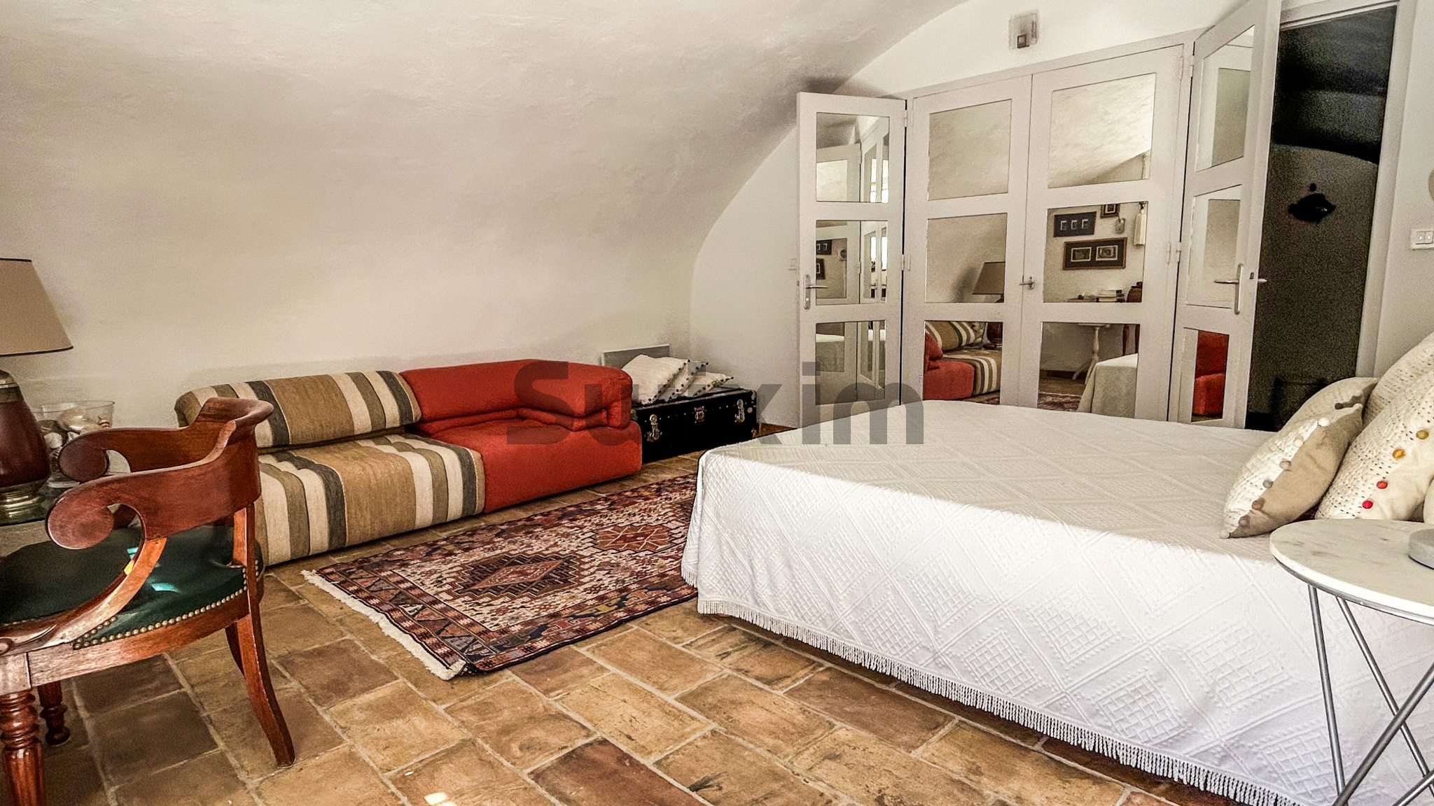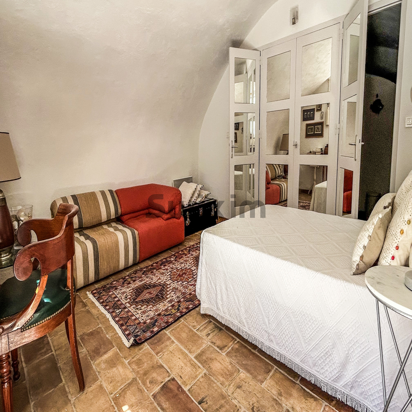 La maison principale se compose d’une vaste cuisine dinatoire d’environ 30 m² et d’un salon avec cheminée (environ 24 m²), tous deux ouverts sur une belle terrasse ombragée par une vigne, offrant un panorama remarquable. À ce niveau également, une grande salle d’eau avec WC, baignée de lumière.