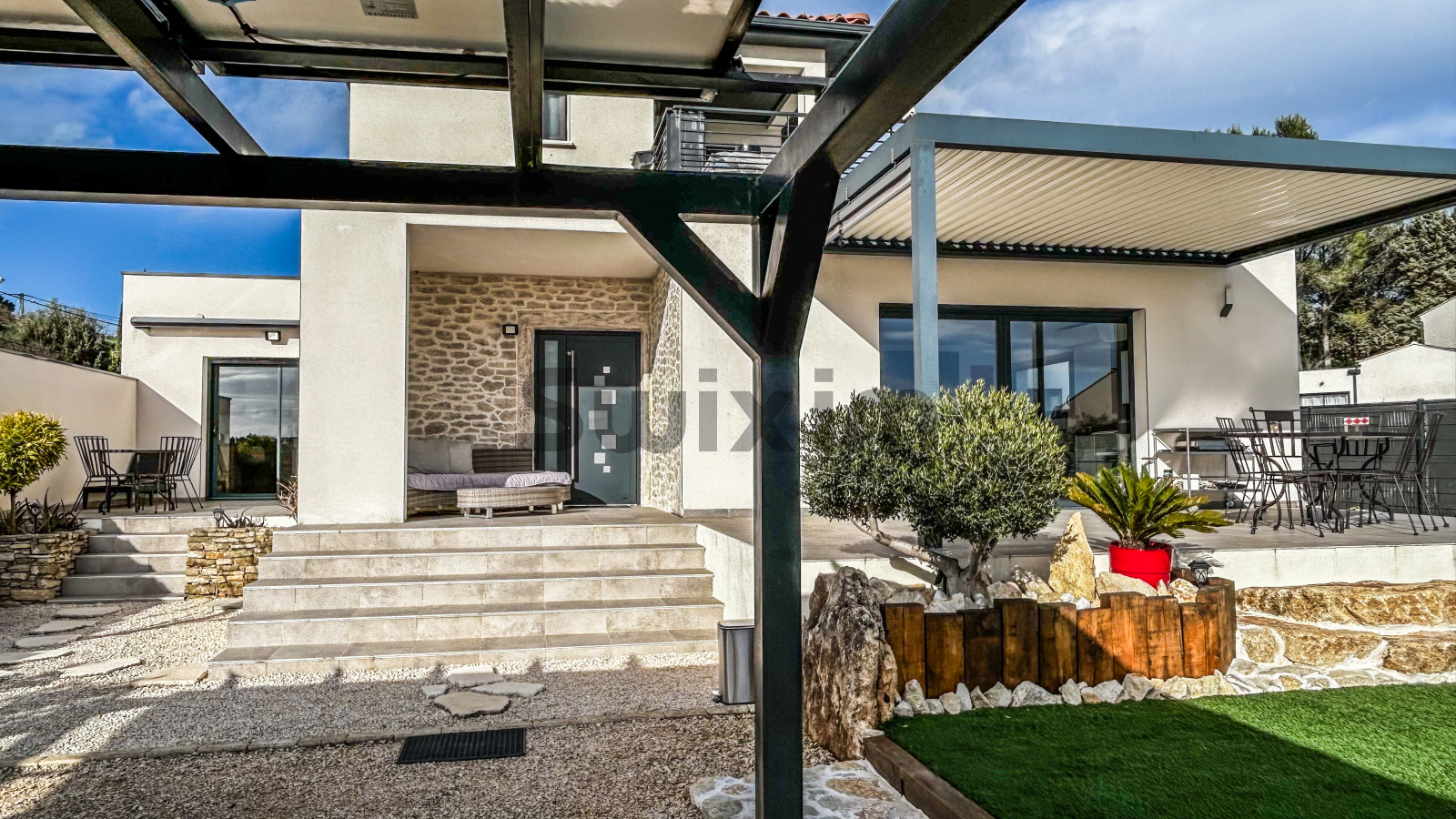 Au RDC, une entrée accueillante avec toilettes invités dessert un vaste séjour baigné de lumière ouvert sur une terrasse plein sud équipée d'une pergola bioclimatique. La cuisine semi-ouverte, moderne et parfaitement équipée ravira les passionnés de gastronomie. Ce niveau comprend également une chambre avec rangements, une salle d'eau et toilettes séparés. A l'étage, une véritable suite parentale avec double douche, toilettes séparées, dressing sur mesure accueillant un petit espace bureau et une superbe terrasse panoramique d'envion 50 m2.
