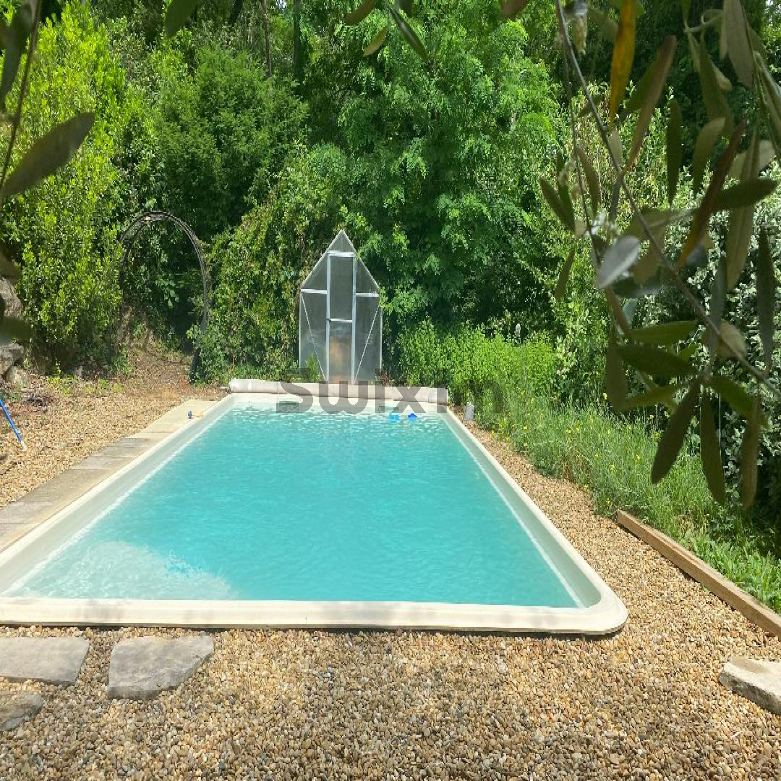 Terrain clos de 1605m² aménagé avec abri voitures, végétation et piscine.