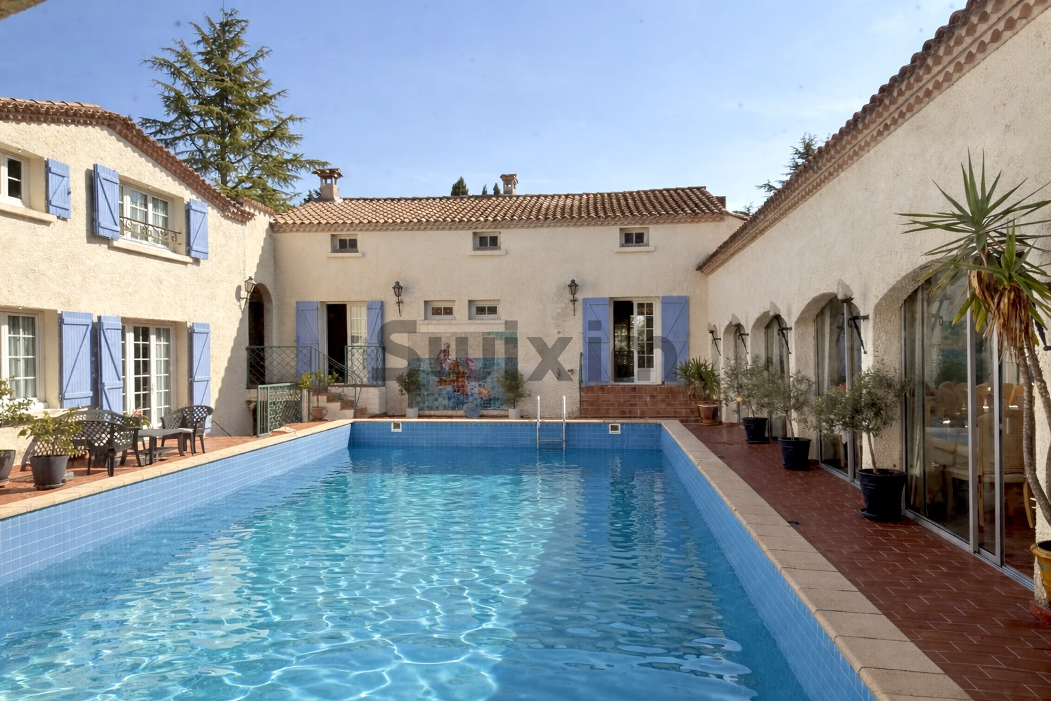 Une grande piscine, un solarium et des terrasses vous invitent à profiter pleinement du climat ensoleillé du sud. De nombreux espaces de stationnements couverts ou non à l’intérieur de la propriété complètent ce bien. Arrosage et éclairage automatiques, digicode, vidéo surveillance, forage.