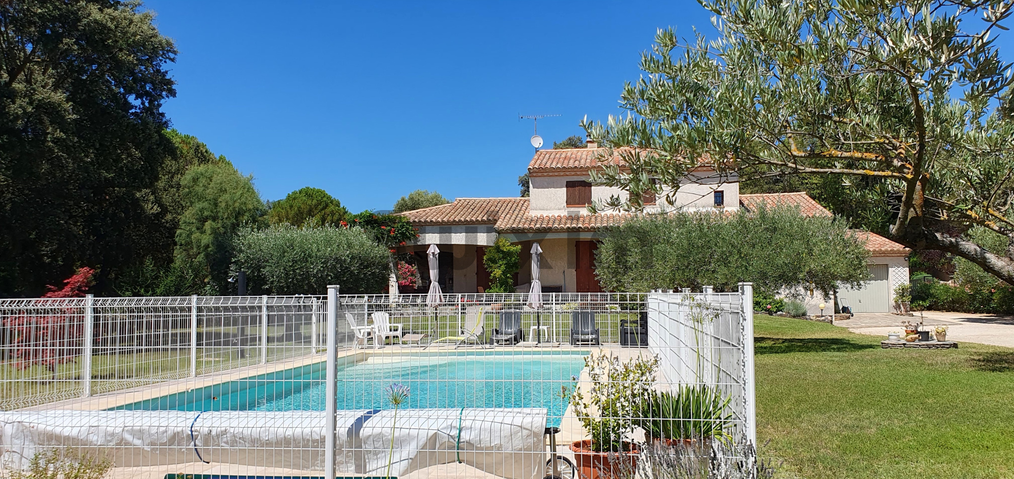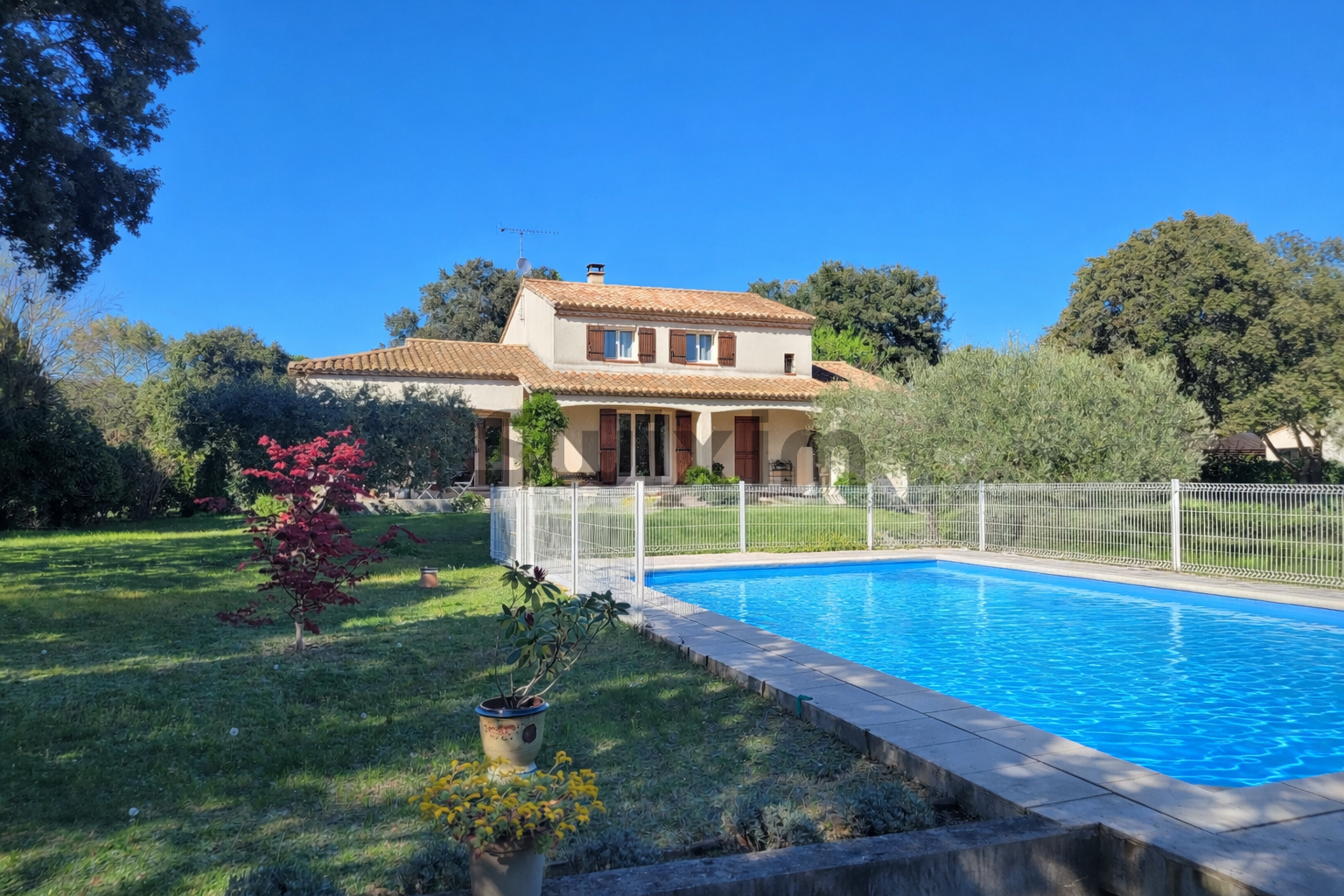 À l’extérieur, la propriété s’étend sur un superbe terrain arboré d'environ 2700m², offrant un cadre verdoyant, paisible et sans vis-à-vis. Une élégante piscine complète cet ensemble, idéale pour profiter pleinement des journées ensoleillées.