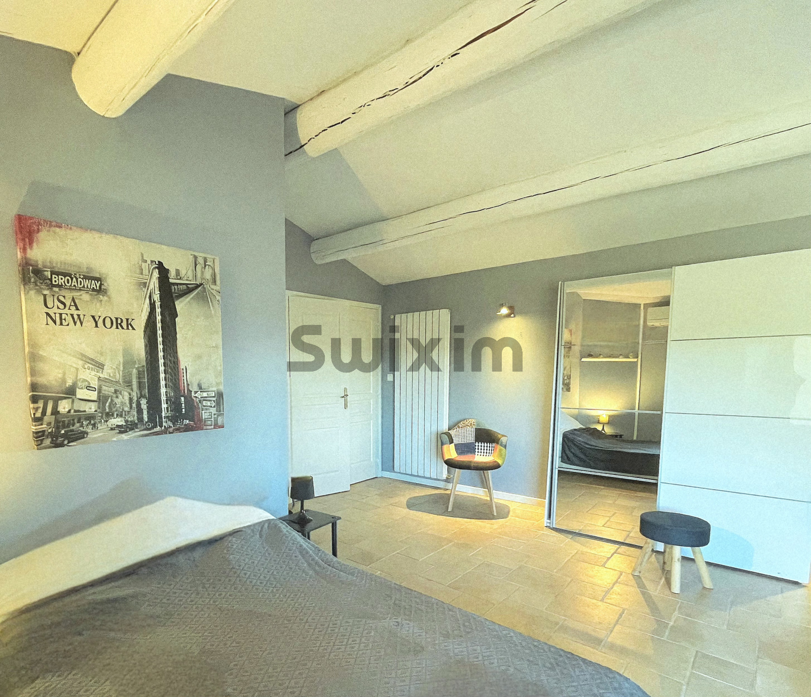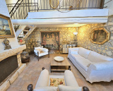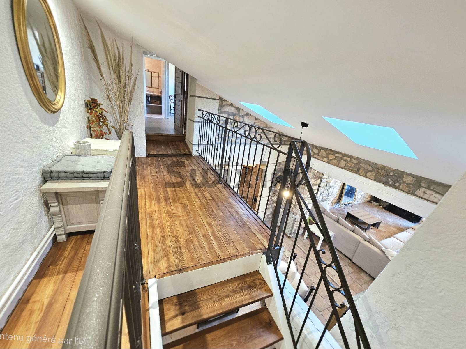 Le mas, tout en pierre, offre une superbe pièce de vie de 70 m², sublimée par ses volumes généreux, sa grande hauteur sous plafond, ses baies vitrées ouvertes sur le jardin et son ambiance chaleureuse entre cheminée à foyer fermé et lumière traversante.