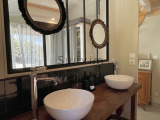 La suite parentale avec mezzanine, délicatement séparée par une verrière, dévoile avec élégance une baignoire îlot au charme rétro et une double vasque.